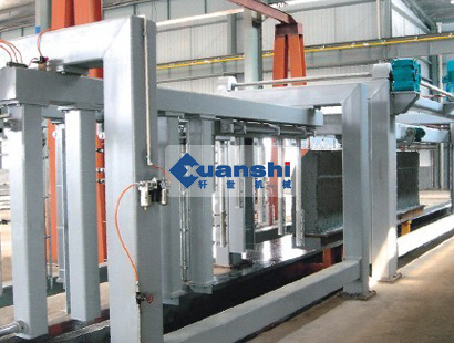 (2)坯體行走:預養好的坯體帶模空中翻轉90度,然后將坯體放在切割小車上或輥道上,由脫模機構脫去模框。坯體通過小車或輥道行走進行水平切割,切割好后坯體繼續前行至橫切位置定位,進行橫向切割,切割好后前行由行車吊走坯體。
